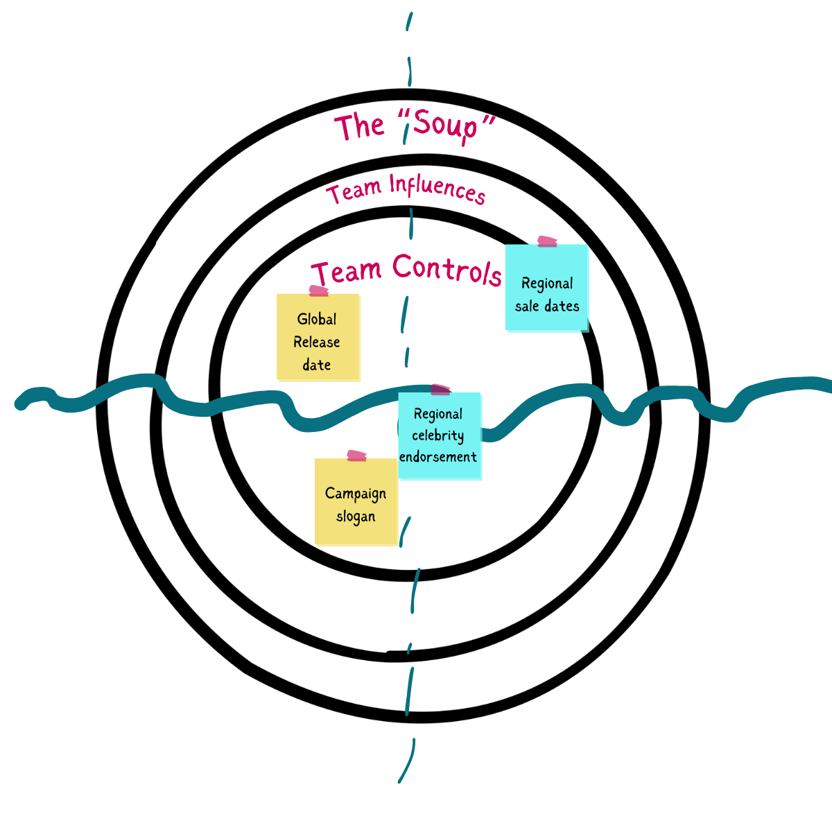 Draw three concentric circles, representing varying levels of control: Direct control, Influence, and External Factors—or 'The Soup.'