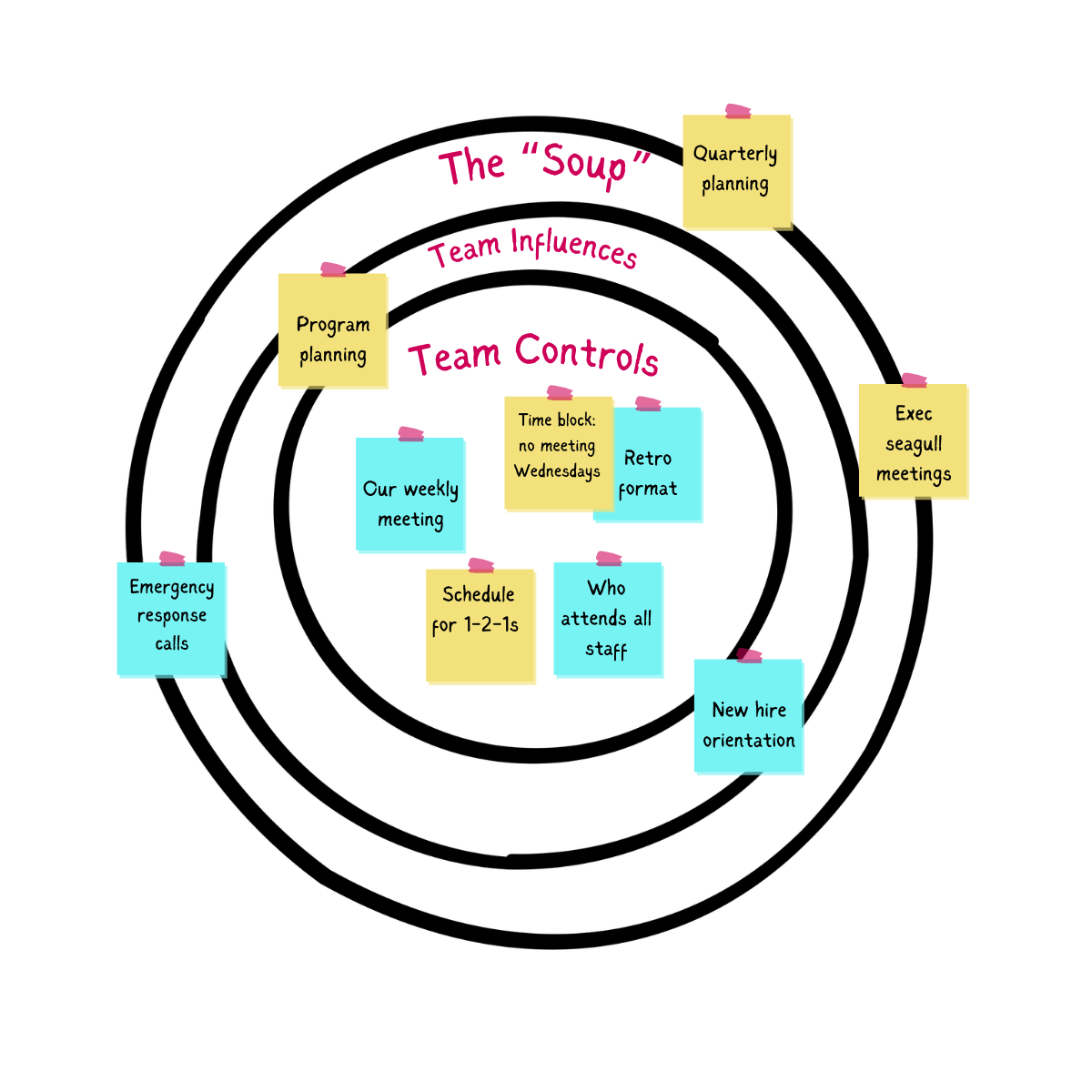 So, before the team decides on their next steps, they use Circles & Soup to map out which changes they can make directly versus those they'll need to campaign for. This gives leaders clear first steps by starting with their own meetings and strategies for spreading their new meeting habits with the people they influence.