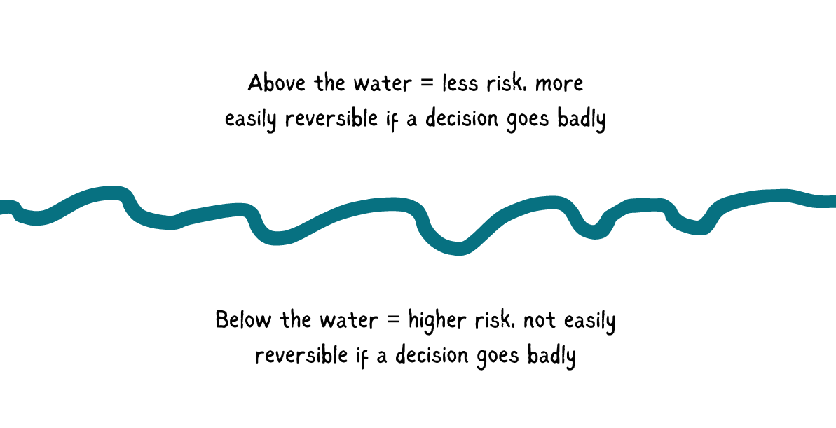 The Waterline principle (another simple, brilliant concept) maps the low-risk decisions that can be made without much discussion above the waterline and the riskier decisions that should involve more input and rigor below the waterline.